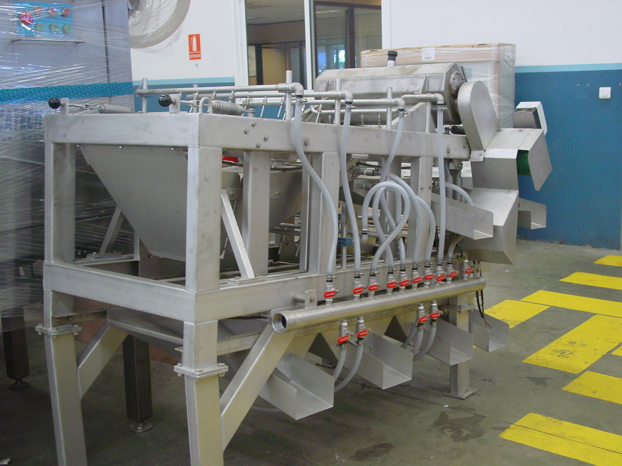 • Bandejas de clasificación: Estructura de soporte para las calles de clasificación, compuestas por un conjunto de guías de aluminio anodizado, con apertura en su sentido longitudinal. Acción vibratoria y responsable del avance del producto, mediante la actuación de un grupo de acción excéntrico, con motorización independiente.